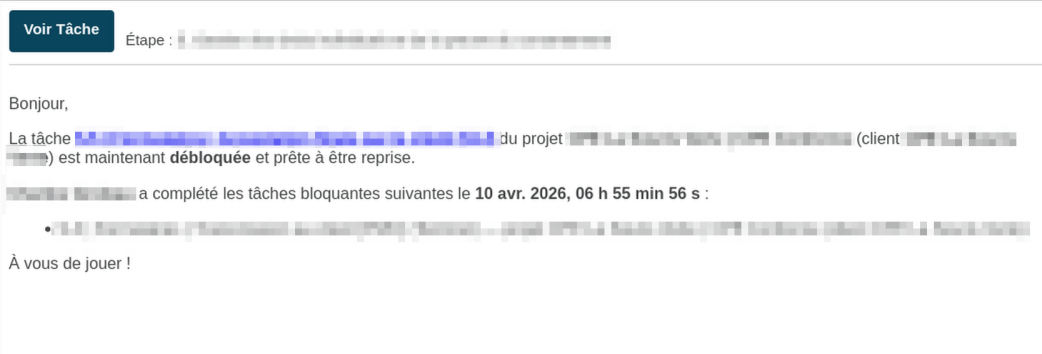Règle un irritant classique dans la gestion de projet : une tâche qui se débloque et qui reste invisible parce que son assigné n'est pas au courant. Le module détecte quand un bloqueur est complété (ou retiré de la liste), et notifie automatiquement les personnes assignées à la tâche nouvellement débloquée. Pipeline courriel standard, donc les préférences de notification de chaque utilisateur sont respectées.
