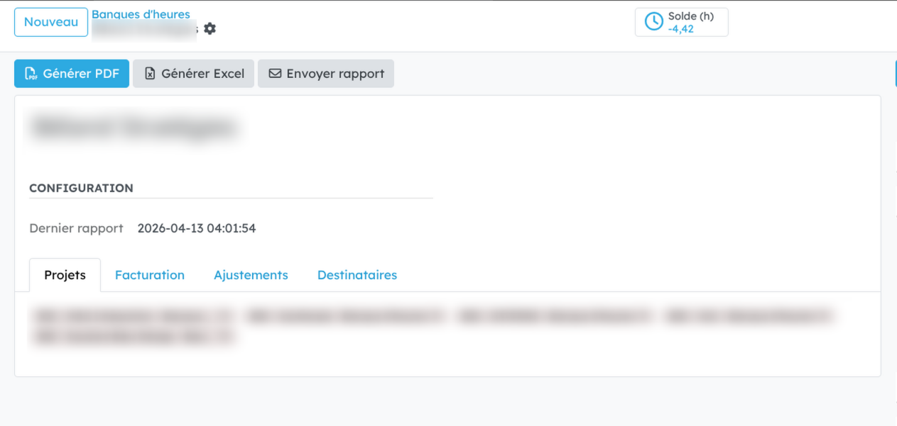 Automatise la facturation au forfait avec banque d'heures. Par client, on configure les filtres (projet, société, produit). Le solde se calcule automatiquement : débits par timesheets, crédits par factures, ajustements manuels. Le rapport PDF/Excel comporte quatre onglets (timesheets, synthèse projet, synthèse mensuelle, heures facturables) et s'envoie automatiquement au client selon une cédule. Portail client en libre-service. Ça met fin aux négociations de fin de mois sur « combien il me reste d'heures ».