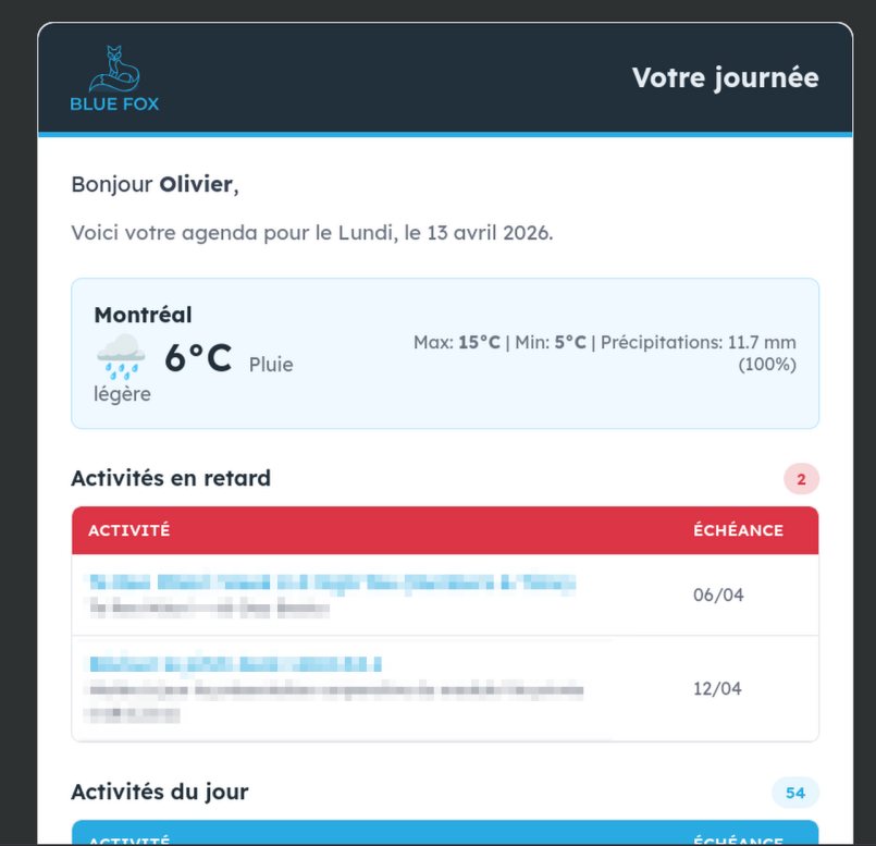 Envoie chaque matin à 4h un courriel récapitulatif : activités et tâches en retard ou dues aujourd'hui, grille des sept prochains jours, météo (emoji, température, précipitations) et une citation inspirante tirée d'un pool de 120. Heures affichées en America/Montreal. Brandé Blue Fox. Ça remplace la routine « j'ouvre Odoo pour savoir quoi faire aujourd'hui » par un survol direct dans la boîte courriel.