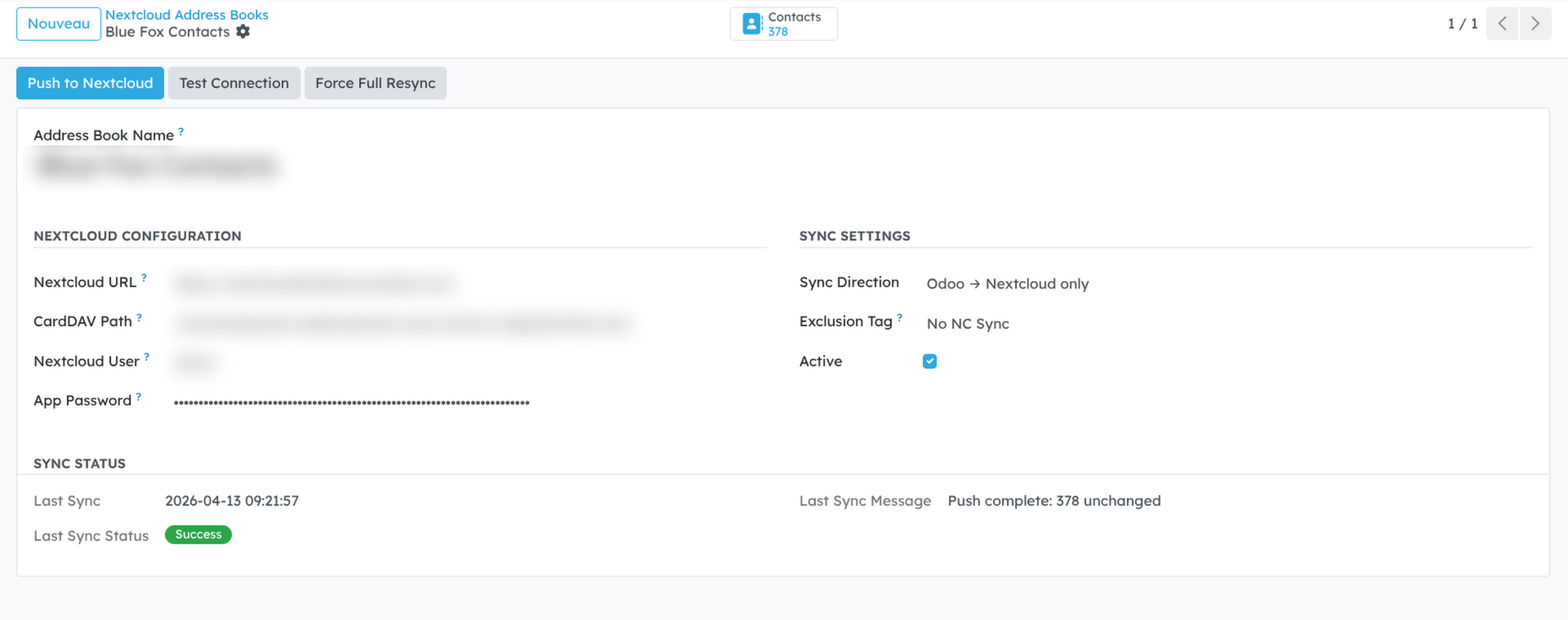 Synchronise les contacts Odoo avec un carnet Nextcloud via CardDAV. La synchronisation est bidirectionnelle, avec détection de changements par ETag, filtrage par étiquette d'exclusion, récupération automatique en cas d'UID orphelin, et credentials chiffrés en base. Concrètement, vos contacts Odoo apparaissent dans l'app Contacts de votre téléphone, et les modifications remontent dans l'ERP sans qu'on y pense.