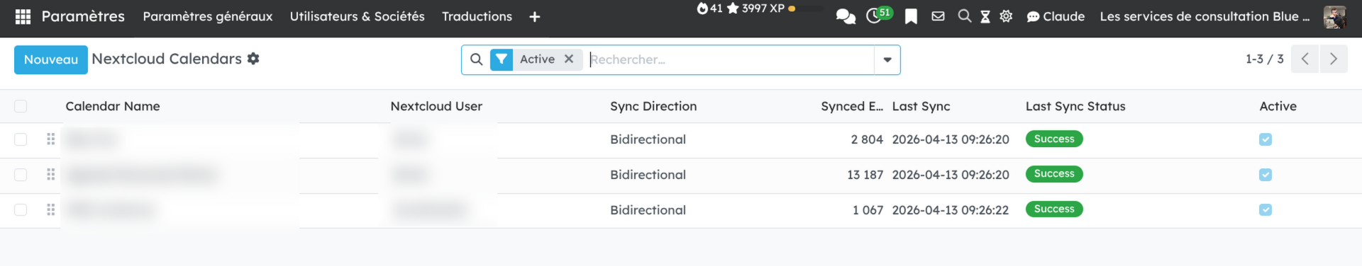 Même pont, pour les calendriers. CalDAV standard, support des événements récurrents (RRULE), synchronisation incrémentale avec sync-token RFC 6578, et propagation par webhooks pour le temps réel. Les couleurs de calendrier sont préservées. Utile quand on veut voir ses rencontres Odoo dans Thunderbird ou sur iOS, ou l'inverse.