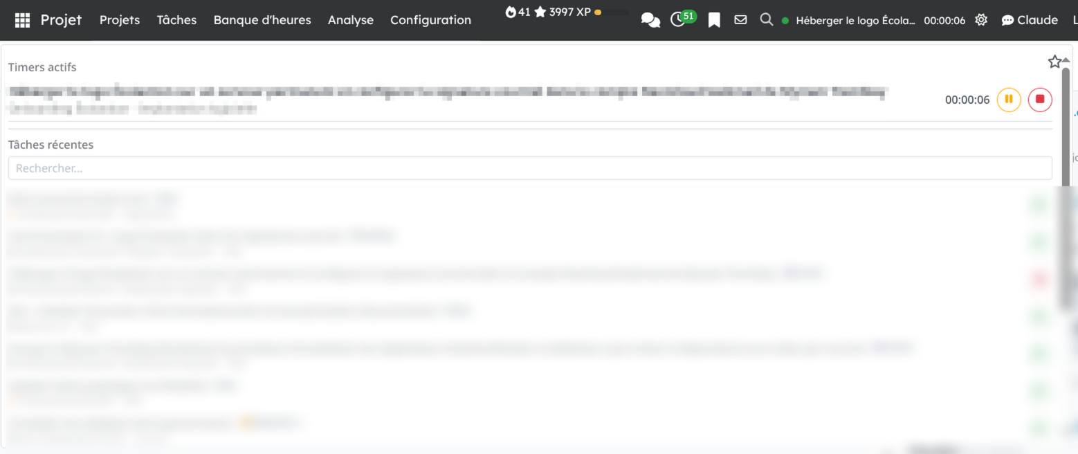 Un minuteur OWL qui vit dans la barre système d'Odoo. Démarrage, pause, reprise, avec support multi-timers. Les 10 tâches récentes en tête de liste (favoris épinglés en premier). À l'arrêt, dialogue avec arrondi configurable (1, 5, 10 ou 15 minutes) et remplissages rapides de description. Raccourci clavier Ctrl+Shift+T. Indicateur visuel qui change de couleur selon la durée, pour rappeler qu'une tâche dure peut-être plus qu'elle ne devrait.