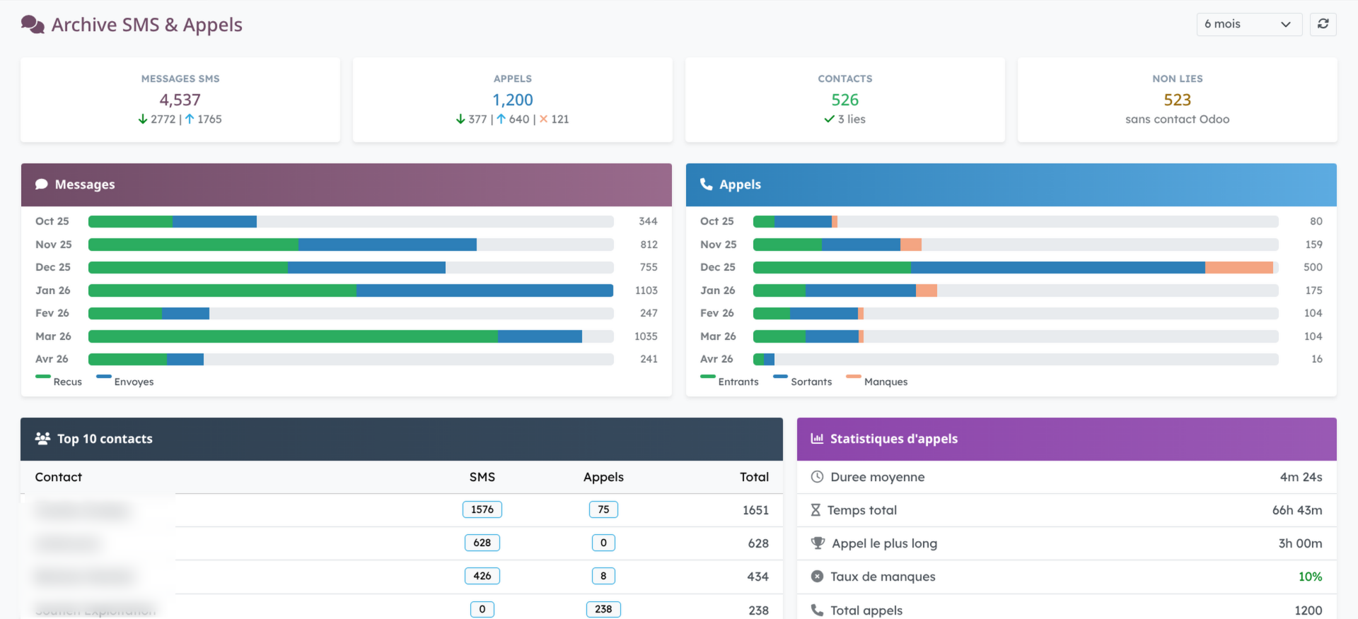Ajoute une vue centralisée (envoyés + reçus) avec auto-catégorisation (Client, Interne, Fournisseur, Notification, Marketing), suivi du statut et métriques de temps de réponse. Tableau de bord OWL avec filtres de date, cartes KPI, top contacts, graphique de volume. Synchronisation incrémentale toutes les 5 minutes. Déduplication par Message-ID RFC 2822. Ça remplace partiellement l'ouverture constante d'un client mail séparé.
