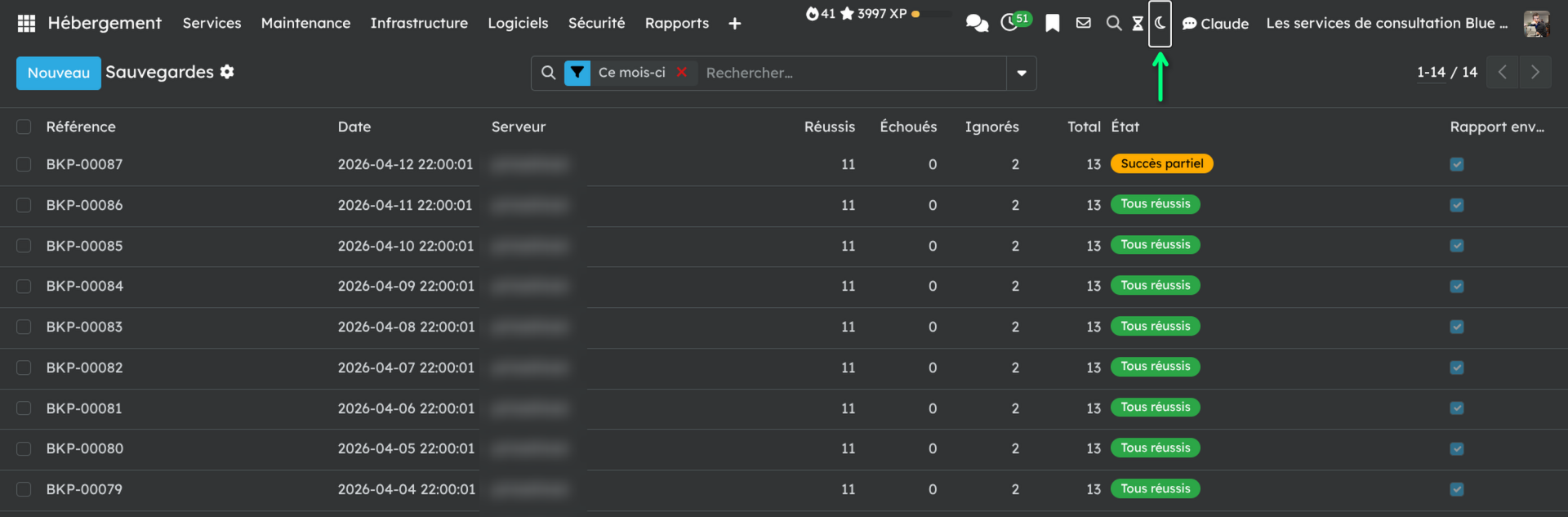 Un bouton soleil/lune dans la barre système qui bascule tout le back-office d'Odoo en mode sombre. Palette de gris Blue Fox (#2E3132, accent #29ABE2). Préférence persistante par cookie navigateur. Couverture exhaustive d'Odoo 18 : variables Bootstrap 5, vues, chatter, alertes, responsive mobile. Aucun impact quand désactivé. Les yeux en remercient les utilisateurs à 22h.