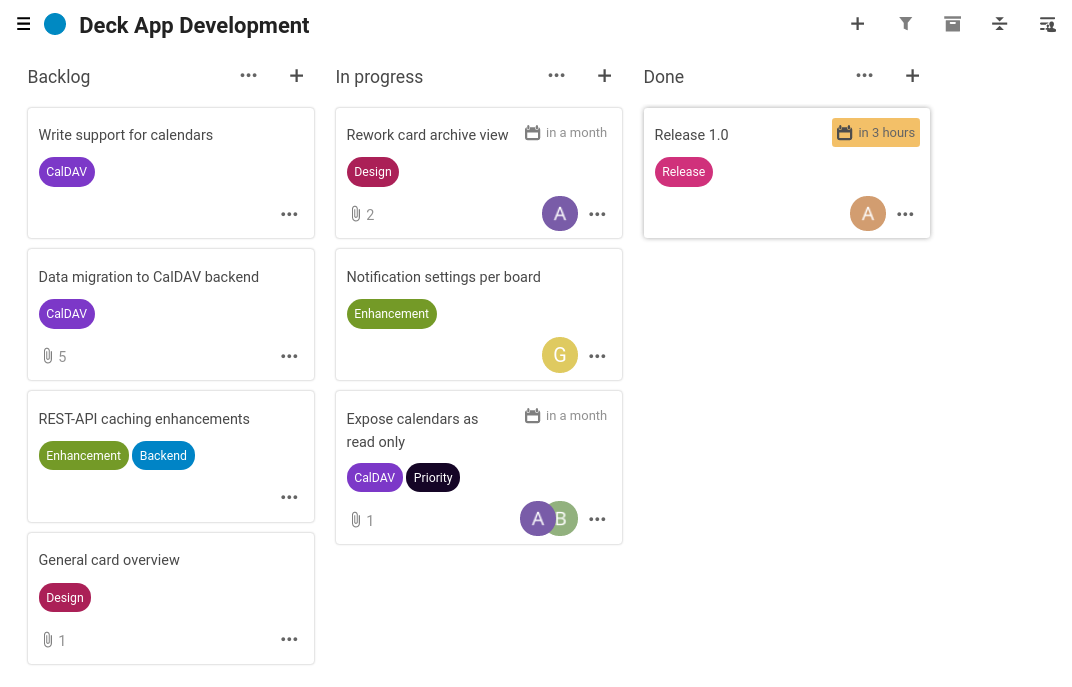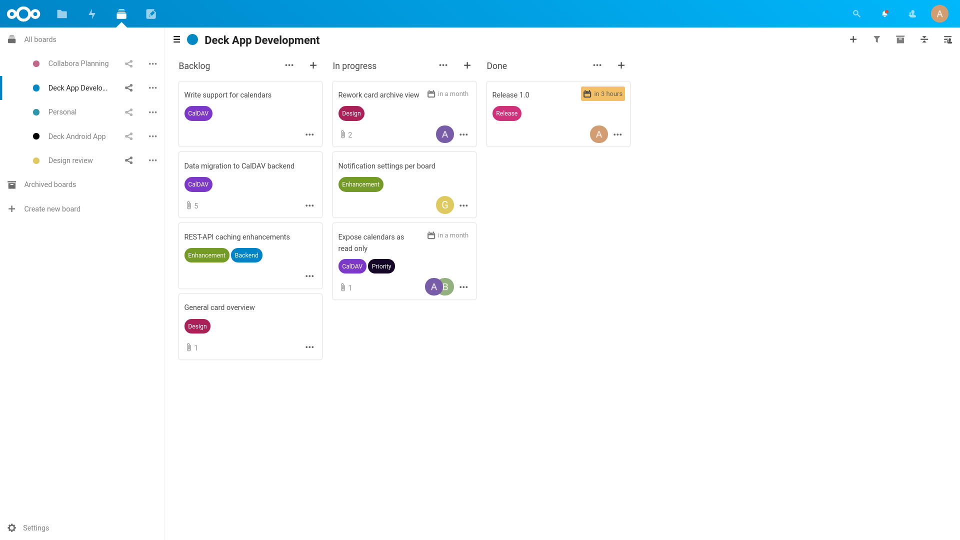 Calendrier : les échéances des cartes apparaissent automatiquement dans l'agenda Nextcloud. Si vous synchronisez votre calendrier sur votre téléphone (via CalDAV), vos tâches Deck y apparaissent aussi. Pas de double saisie.
