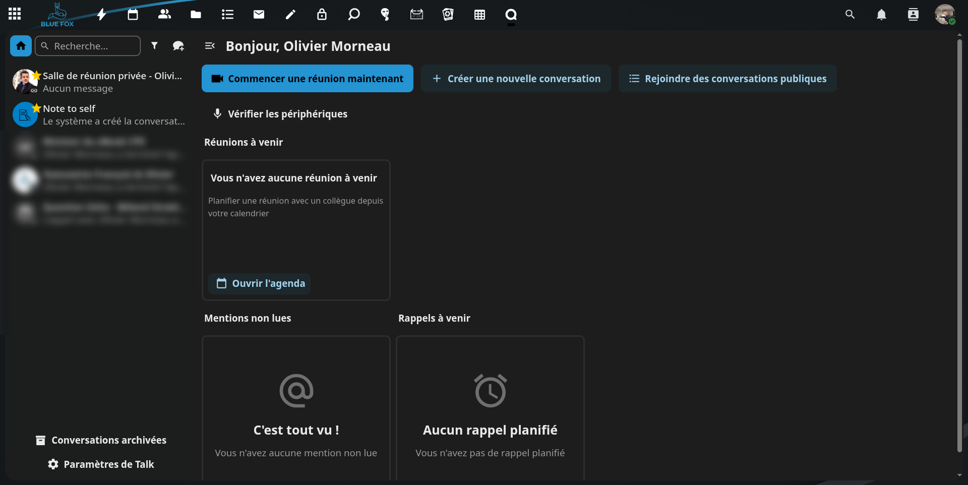Interface de Nextcloud Talk : cet outil intégré permet d’échanger par écrit et en visioconférence de façon sécurisée, le tout depuis votre cloud privé.