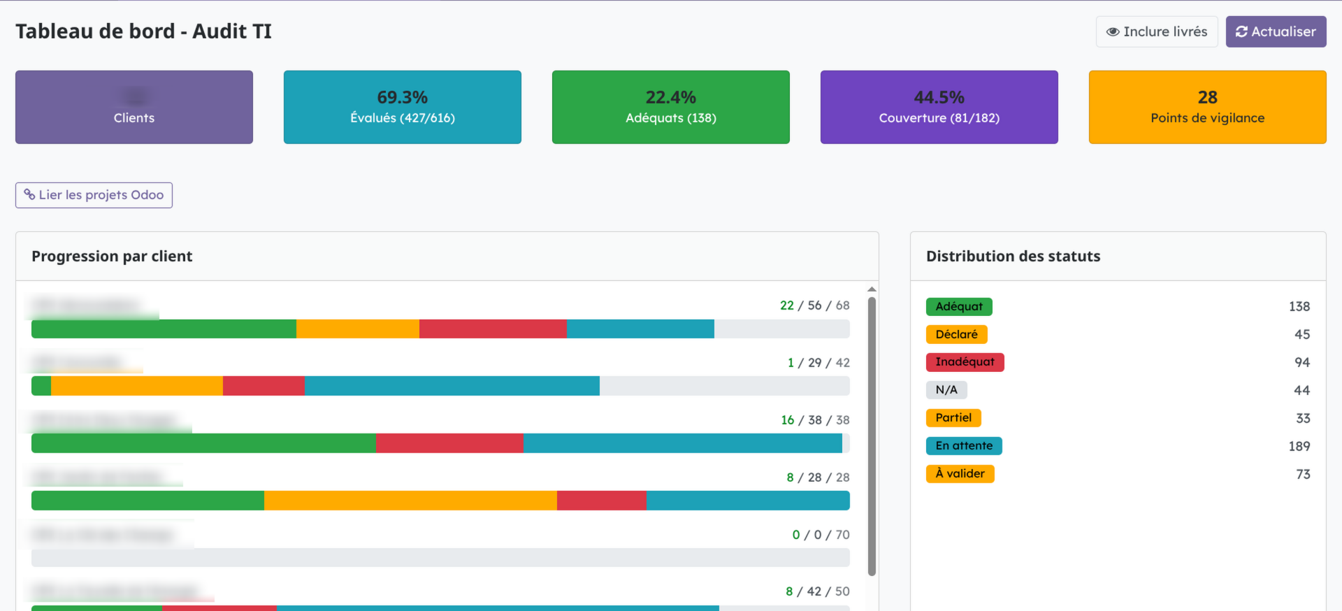 Gestion des audits de sécurité des fournisseurs TI, toujours dans l'optique Loi 25. Grille de 14 éléments par fournisseur, matrice client × fournisseur avec statuts d'évaluation, tableau de bord OWL avec KPI empilés, flux de travail en deux phases (En cours, Livré), suivi des watchpoints et impression batch de rapports PDF. C'est la mécanique qui produit les synthèses d'audit TI qu'on livre à nos clients, notamment dans le réseau des CPE.