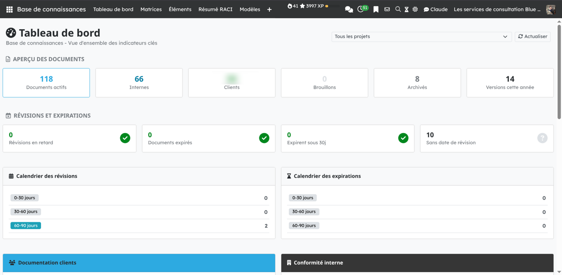 Notre module le plus ambitieux. C'est un système complet de gestion des connaissances organisationnelles : documents versionnés avec matrice décisionnelle, registre des résolutions (CA et actionnaires), registre des administrateurs, calendrier de conformité annuel, coffre de credentials chiffrés, suivi de distribution et d'accusé de réception. Dix niveaux de maturité documentaire, générateur de PDF brandé, intégration au module projet d'Odoo. On l'utilise chez la plupart de nos clients PME pour structurer leur documentation interne sans qu'ils aient à choisir entre dix outils différents. Un pitch deck corporatif détaille l'approche quand on entame un mandat.