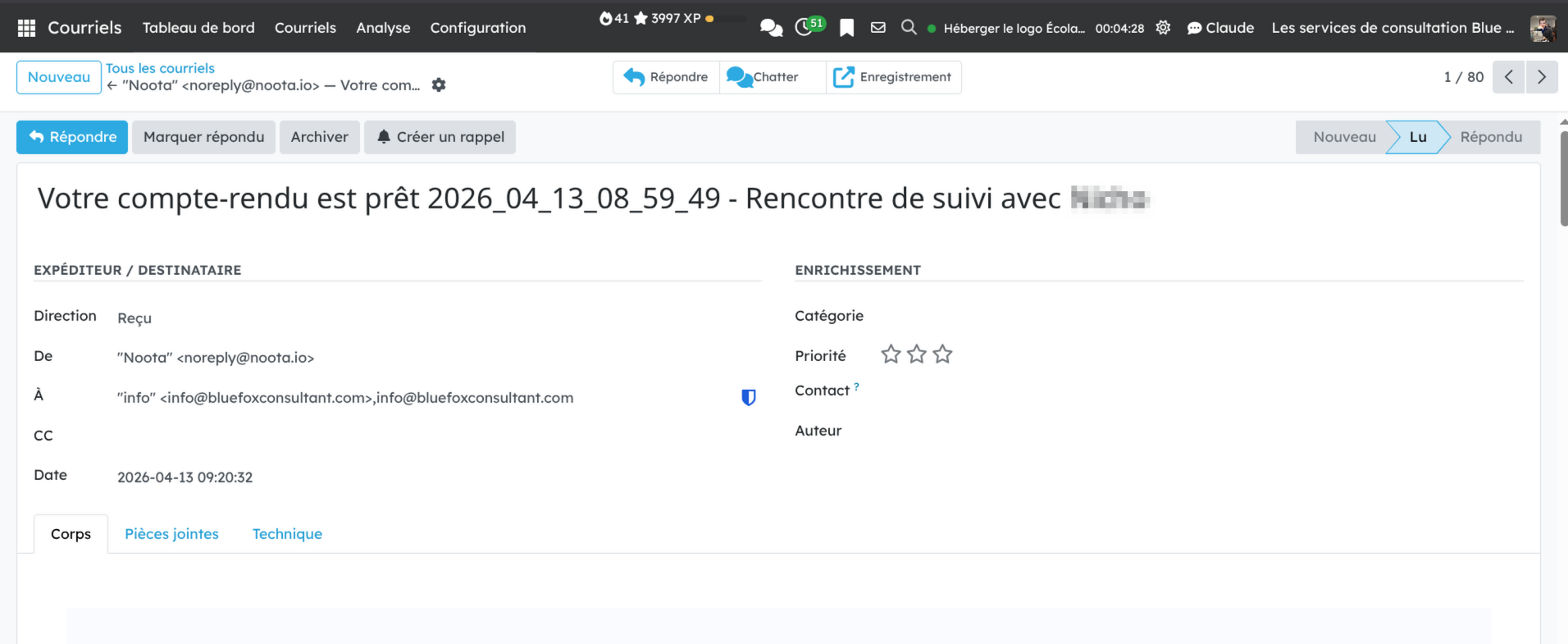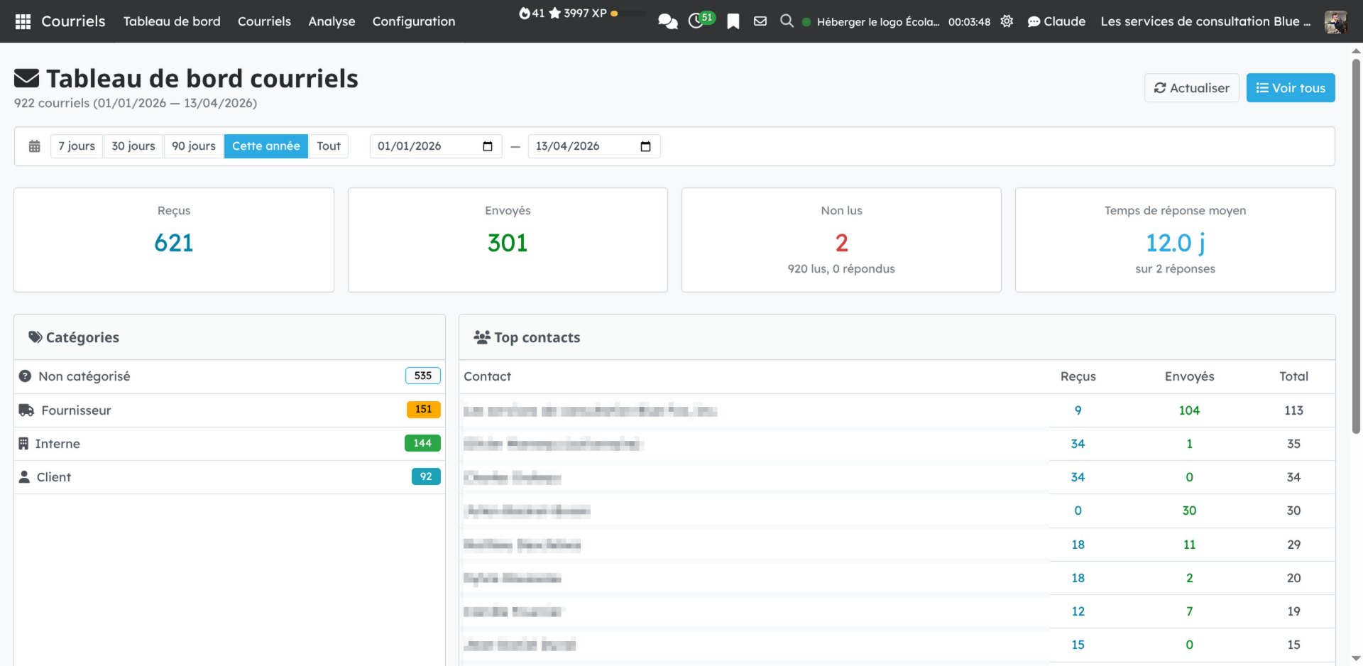 Ajoute une vue centralisée (envoyés + reçus) avec auto-catégorisation (Client, Interne, Fournisseur, Notification, Marketing), suivi du statut et métriques de temps de réponse. Tableau de bord OWL avec filtres de date, cartes KPI, top contacts, graphique de volume. Synchronisation incrémentale toutes les 5 minutes. Déduplication par Message-ID RFC 2822. Ça remplace partiellement l'ouverture constante d'un client mail séparé.