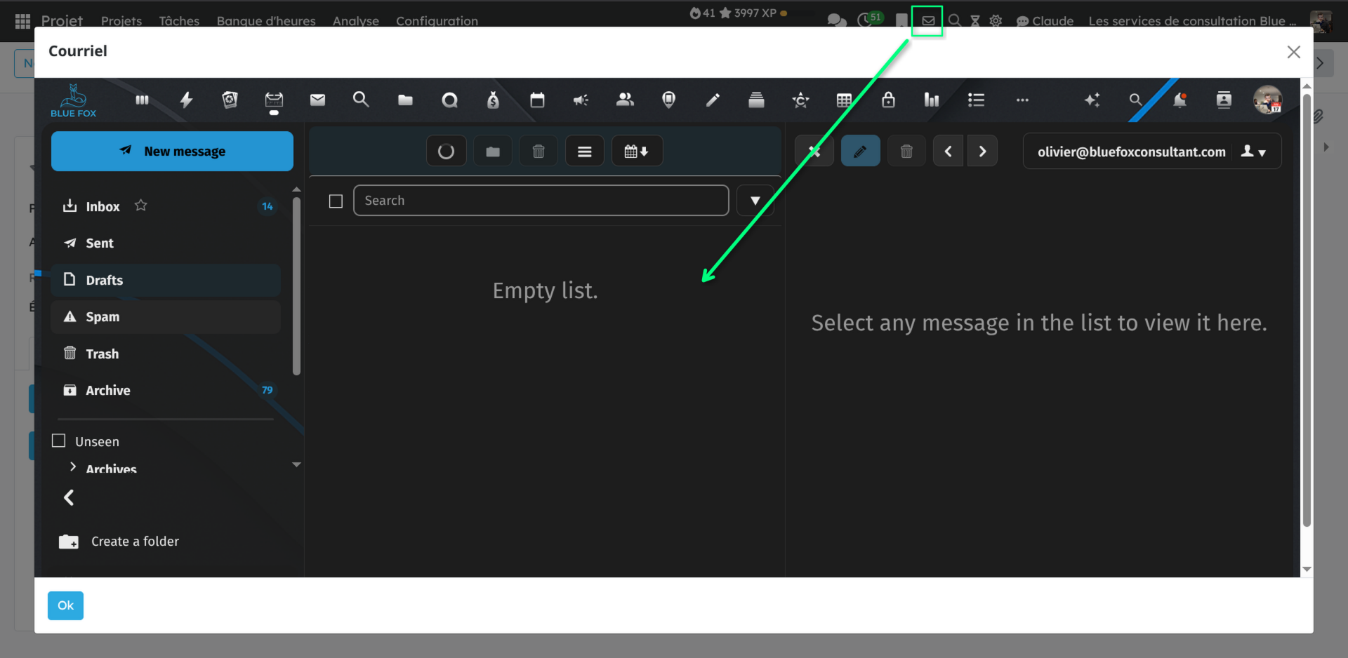 Le plus simple des 19 : une icône dans la barre système qui ouvre SnappyMail (ou n'importe quel webmail) en modale, sans quitter Odoo. URL configurable. Zéro persistance de données. Conçu pour ceux qui vivent dans Odoo et qui veulent un raccourci mental vers leur courriel sans changer d'onglet.