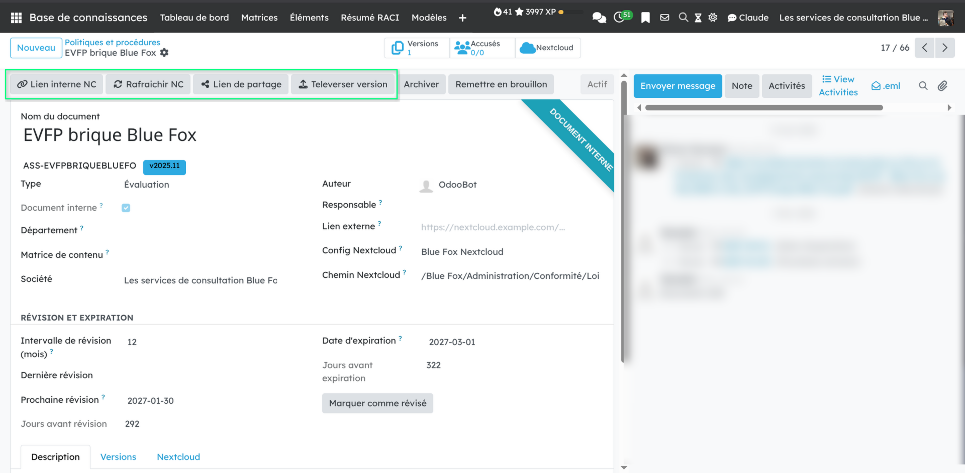 Sort les fichiers du disque Odoo pour les stocker sur Nextcloud. Odoo garde les métadonnées, la version et les flux de travail, mais le fichier vit sur NC. Ça permet de partager un document avec un client via lien Nextcloud protégé par mot de passe, depuis l'interface Odoo. Ça règle aussi le problème classique des pièces jointes qui font gonfler la base de données.