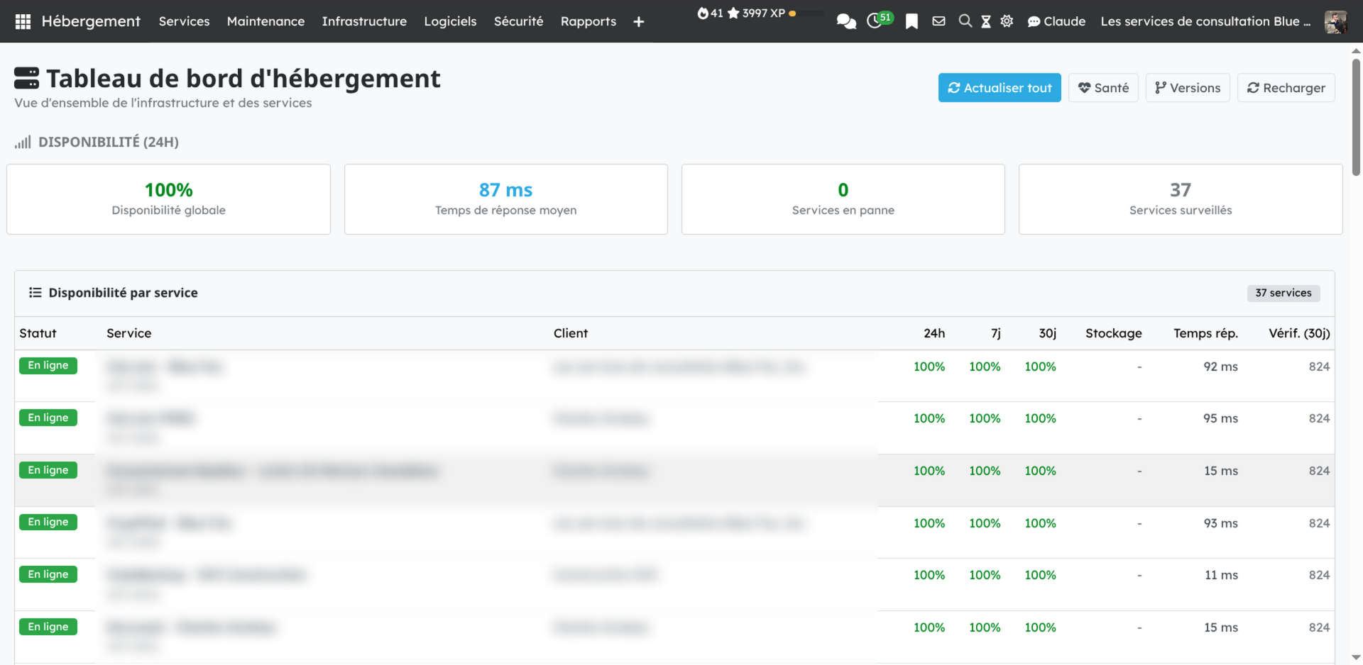 Notre module d'hébergement géré, et la colonne vertébrale du service d'infogérance Blue Fox : cycle de vie des services (brouillon, actif, expiré), catalogue de logiciels avec vérification de versions (GitHub, Docker Hub, GitLab), contrôles de santé HTTP avec retry rapide, uptime, alertes courriel et ntfy, fenêtres de maintenance, surveillance des quotas de stockage, suivi des expirations de domaine et SSL, gabarits de maintenance par logiciel, intégration des sauvegardes avec vérification SHA256, courriels brandés au client. C'est ce qui nous permet de gérer tout notre parc de services hébergés sans perdre le fil.
