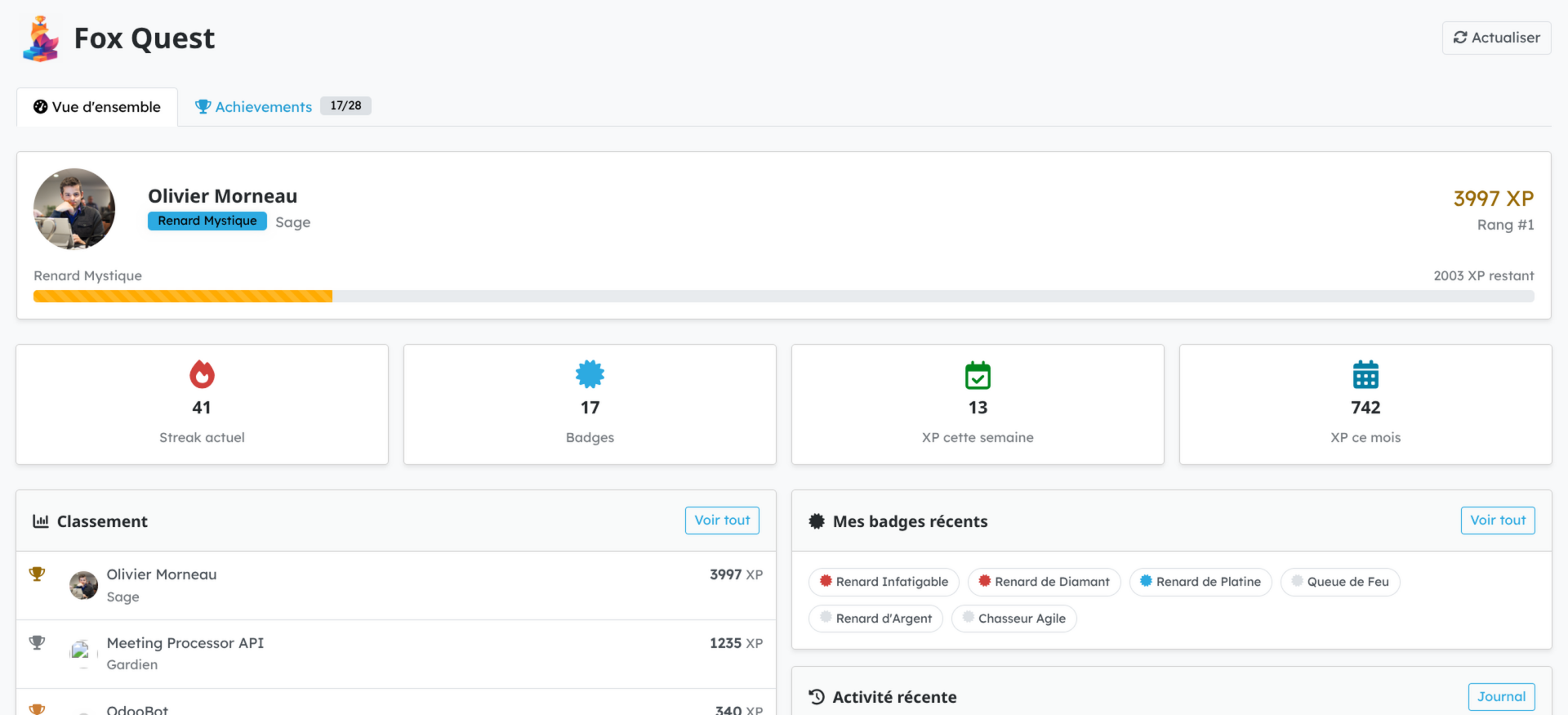 Une couche gamifiée sur Odoo, thème renard : 10 niveaux (de Renardeau à Kitsune, de 0 à 20 000 XP), règles XP configurables (timesheets, tâches, documents, hébergement, messages, helpdesk, activités, séries), 15 badges par défaut en six catégories, palmarès, popups temps réel via le bus Odoo, widget barre système (XP, série, progression), magasin de récompenses avec flux de réclamation. Pas essentiel à l'opération, mais ça injecte un peu de joie dans un ERP.